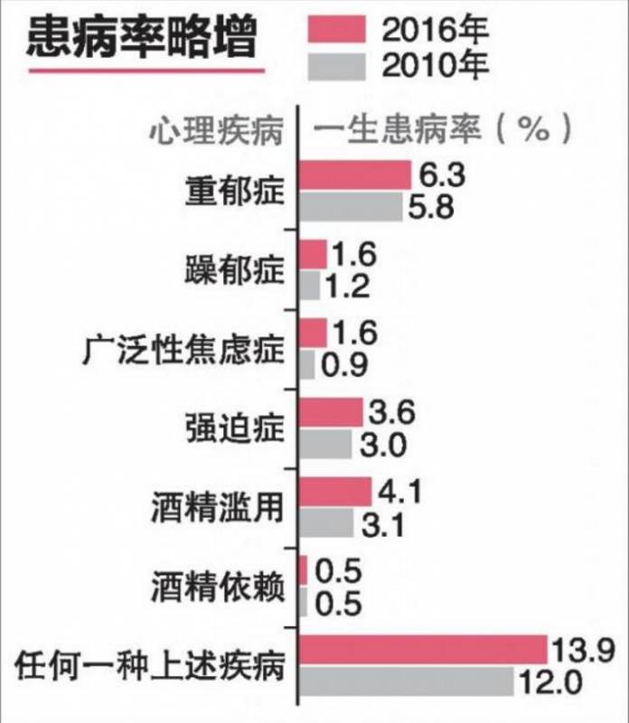 调查涵盖的六种心理疾病是重郁症这个较严重的抑郁症、