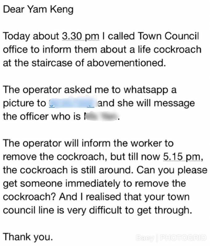 马炎庆在脸书上po出了这件事情,他感谢居民费心拨打热线,反映组屋受蟑螂侵害的问题,还表示希望热线服务可以加强便民性。