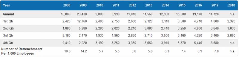 第三季度被裁退的人数有所减少,2860人略低于上一季度的3030人。企业重组与调整仍是今年头九个月裁员的最主要原因。
