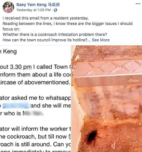 淡滨尼居民向市镇会申诉组屋楼梯口有一只活蟑螂,两小时仍无人来抓,竟附上照片电邮议员马炎庆求助,还申诉市镇会热线很难打通。也是淡滨尼集选区议员的文化、社区及青年部政务次长马炎庆,在(12月11日)下午在社交媒体上分享,有一名居民发了一则电邮向他反映,组屋组屋楼梯口有一只活蟑螂。