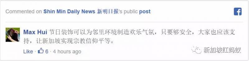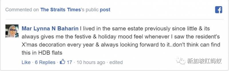 一位名叫Lynna的网友也称:早前,我就一直住在这一组屋区,每当我看到这个圣诞装饰,总能让我感受到节日的气氛。我对这样的行为很是期待,但就怕在组屋区内找不到第二家了。