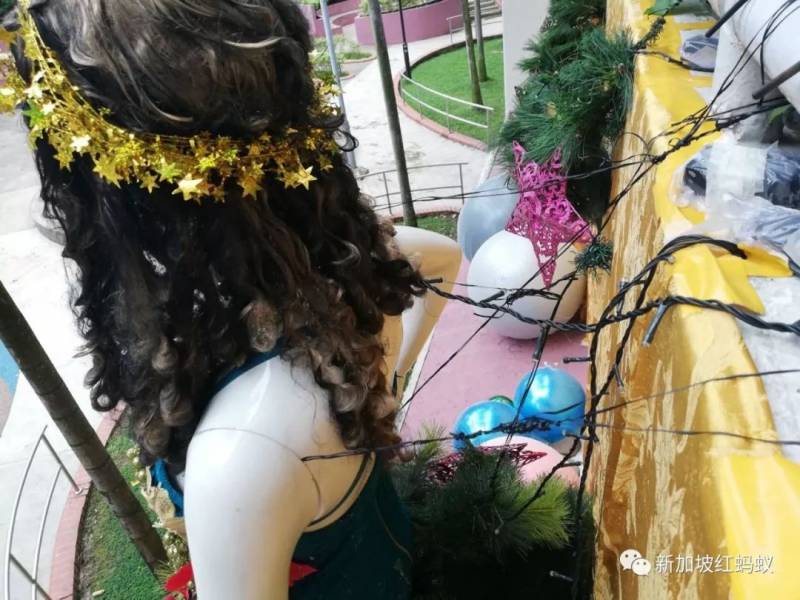 居住在金文泰二巷大牌351二楼的舞蹈教练菲利普(Philip Sobrielo Gene,38岁),在自家走廊外檐用人型女模装饰了一位身高约1米7、穿着圣诞树裙的娃娃。她搭配着金光闪闪的五角星、大小不一的塑胶球、挂件等圣诞装饰,用麻绳固定在走廊外檐的栏杆上,引人入胜。