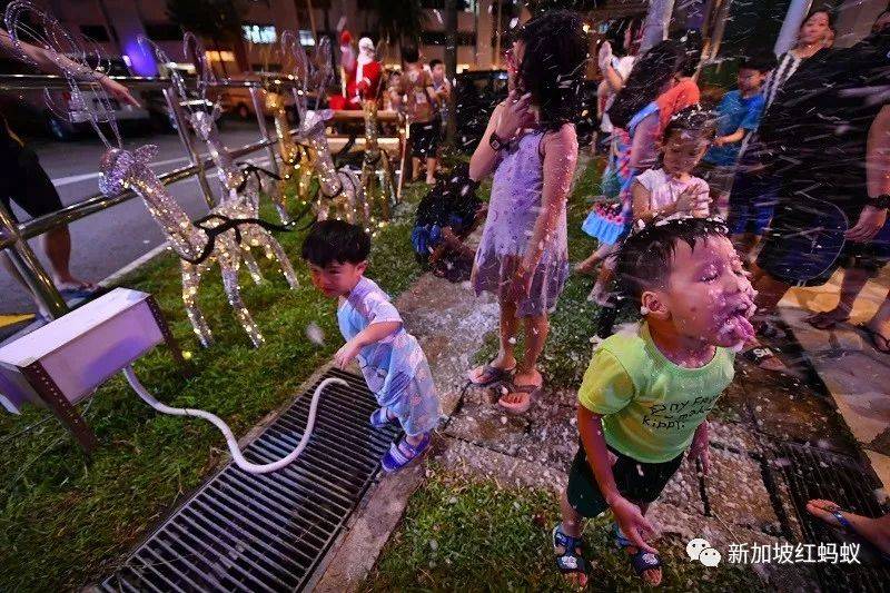 兀兰13街一带的小孩儿在陈先生制作的人造雪陪伴下,欢声笑语,乐此不彼。(海峡时报)