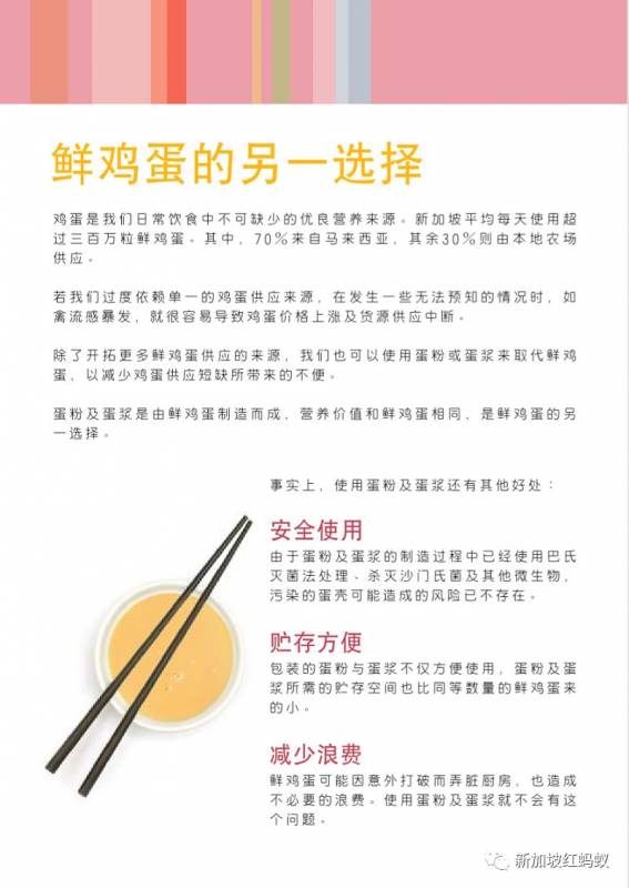 这些年来,农粮局未雨绸缪,推出“武林秘笈”,让国人了解蛋浆和蛋粉的生产过程和使用安全,积极鼓励国人食用。(红蚂蚁看了都想试试味)