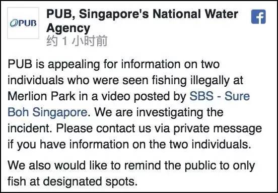 (公共事业局呼吁大家提供关于二人在鱼尾狮公园非法钓鱼的信息,我们正在调查这一事件,如果有关于这两人的信息,请联系我们。我们也提醒大家,在指定的合法地点调鱼)