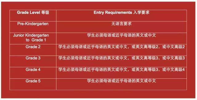 1-5年级:学生在入学前不需要参加测试,只要有名额就可以顺利入学。但入学后需要参加英文水平评估测试,来决定学生适合就读的年级和项目。