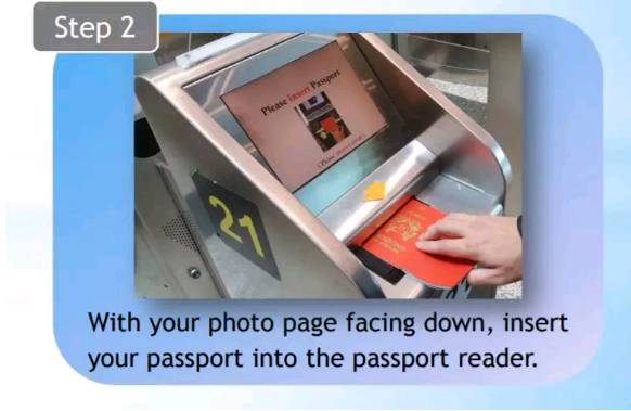 1. 在第一道门前,将护照首页(即有个人信息的一页)朝下,平放推入阅读设备中。