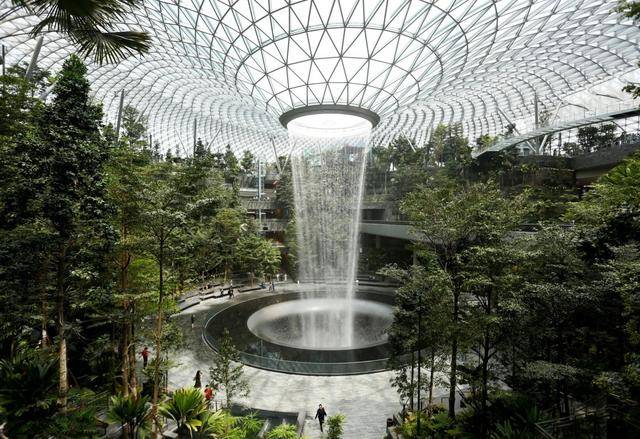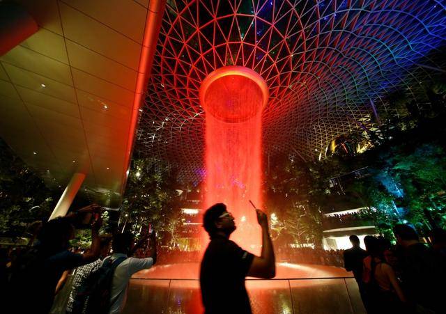 雨旋涡预计每天使用多达50万升的水。星耀樟宜屋顶露天部分可接收雨水,瀑布底下设有储水箱,雨水从屋顶圆口流入这个位于地下三层的水箱,再由水泵抽出来,通过水管输送至瀑布圆口,循环使用,这样就不会浪费水。此外,室内倾泻而下瀑布,还有局部降温的效果!到了夜晚,雨漩涡还会有声光水表演。(图片来源:路透社)