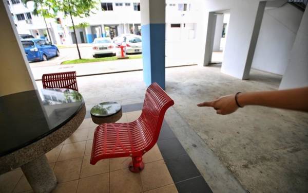 老妇坐在组屋底层的椅子上休息,抢匪从她背后抢走金链金坠。(陈佩敏 摄)