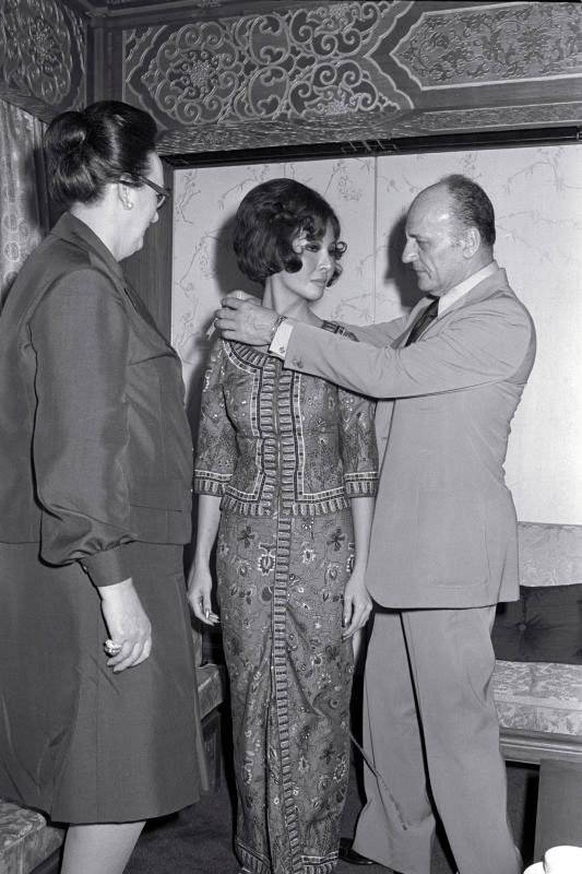 法国设计师Pierre Balmain(右)当年为施妙华(中)测量领口尺寸。(《海峡时报》)