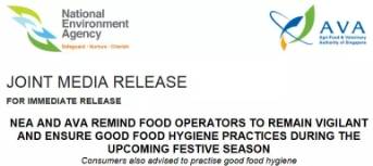 新加坡国家环境局(NEA)和农粮兽医局(AVA)在官网发布联合公告,宣布将在过节期间加强对新加坡餐饮业的检查力度。