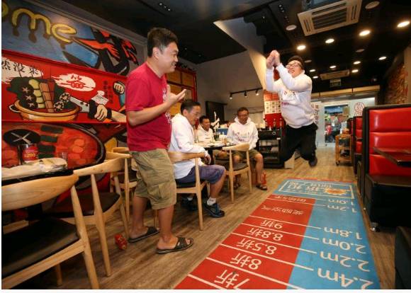 这款游戏是贴在餐馆中央的一个“跳板”,主要分成10格,长度从1米至3米,最低为“倒给5毛”,其他依序是“奖励空气”、九折到六折,甚至“免单”。