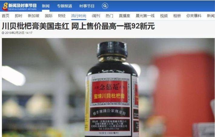 2018年2月,京都念慈菴的川贝枇杷膏在美国纽约突然走红,