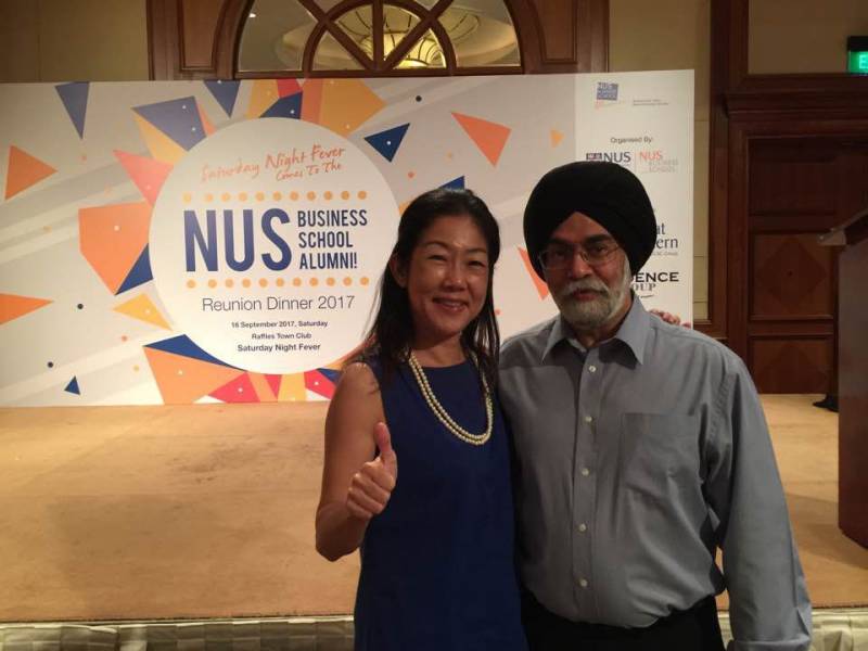 Aki(左)出席新加坡国立大学商学院2017校友晚宴,与EMBA教授Kulwant Singh(右)合影