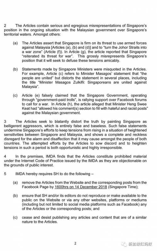 资媒局除了指有关文章包含的“失实陈述严重且极端恶劣”,也强调文章没有反映我国希望友好解决问题的立场,甚至称我国坚决使用武装力量对付马国,并“将柔佛海峡变成战区”。该局补充说,这些文章也错误引述我国部长的言论。