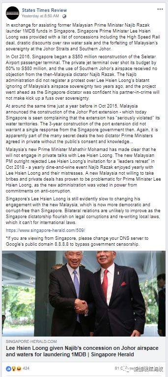 STR在11月5日发表有关一马公司弊案的报道,不实指李显龙总理成为“主要调查对象”。报道更称,马来西亚前任首相纳吉执政期间,与新加坡政府签署新隆高铁和水供等不公平协议,以换取我国帮一马公司洗黑钱。