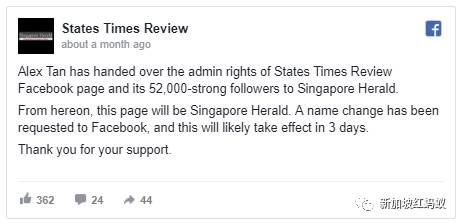 另外,陈智祥也在11月22日在STR的面簿上通知网民,将会把该面簿的管理权以及5万2000名铁粉“移交”给Singapore Herald。STR的面簿也会改名为Singapore Herald。