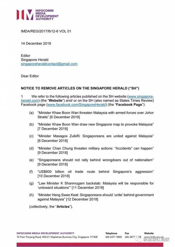 广告Singapore Herald在本月4日至12日之间上载了八篇关于新马争端的不属实报道,结果被资讯通信媒体发展局(IMDA,以下简称“资媒局”)封网。