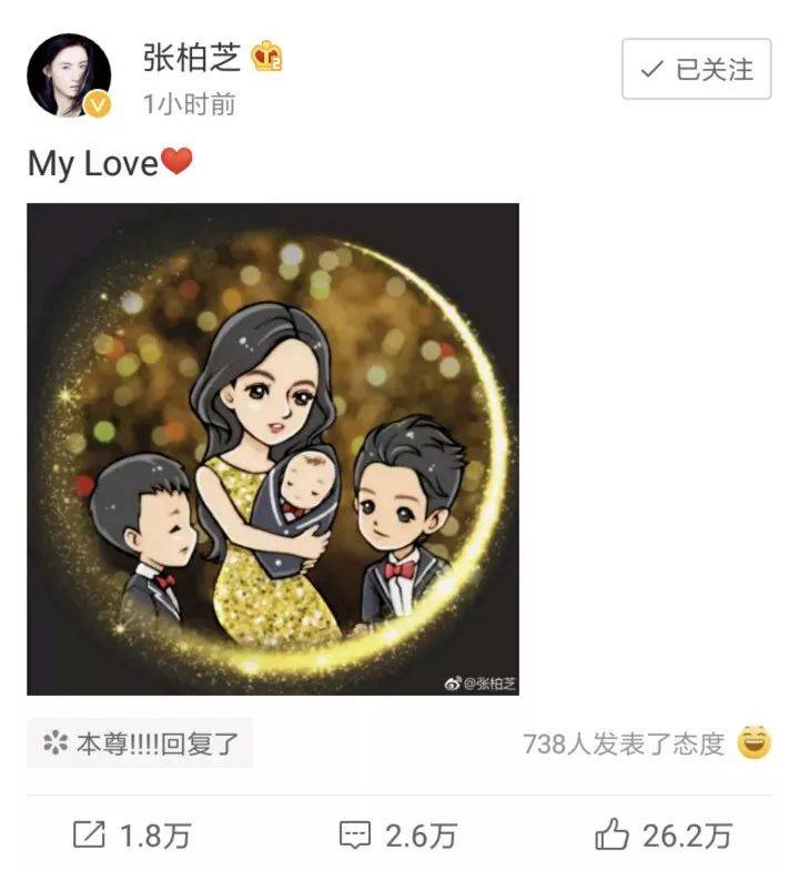 今天(12月17日),张柏芝终于开通微博了,并且首次承认自己诞下三胎!她晒出了一张母子四人的卡通照,并且配文“My Love",向三个儿子告白。