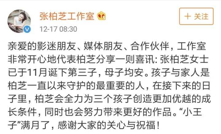 广告张柏芝工作室也发文公布喜讯,称柏芝的小儿子“小王子”今天满月,感谢大家的关心。