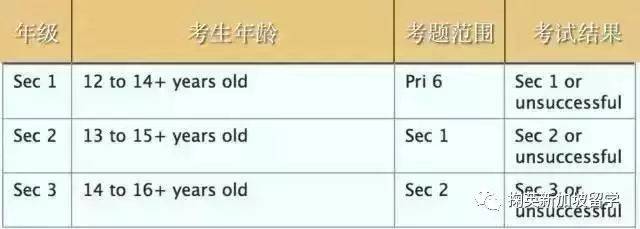 对于外国学生而言,要想升读新加坡的政府中小学,就必须参加新加坡教育统一安排的每年大约在9月份的AEIS(Admission Exercise for International Students)考试,或者每年大约2月份的S-AEIS(Supplementary Admissions Exercise for International Students)考试。教育部会根据考生的考试成绩、所在住址,以及各政府学校的空缺学额情况择优录取,考生无权选择学校。学生可以根据自己的年龄来报读相对应的年级,以下两个表格供大家做参考。小学
