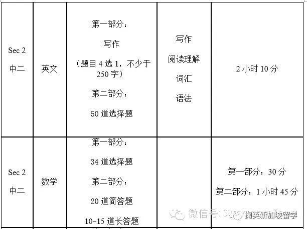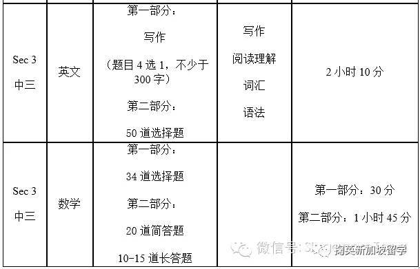 考试科目及详情小学小2/小3英文:36道选择题,测试学生的拼写、词汇、语法、以及阅读理解。小2/小3数学:第一部分为为34道选择题,第二部分为34道简答题(简答题需要写出详细步骤)。小4英语:作文二选一,字数要求100字。词汇,语法,阅读理解的选择题共50道。小4数学:第一部分为36道选择题,第二部分为16道简答题和12道开放式问题(简答题和开放式问题需要写出详细步骤)。中学