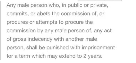 任何男性,不管是在公众场合还是在自己家里和其他男性做一些不可描述的事情,就会被罚监禁,最高可判2年