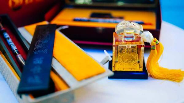 翁清海夫妇还特别请了师傅为儿子制作婴儿胎毛笔和脐带印章,当作送给孩子的纪念品。