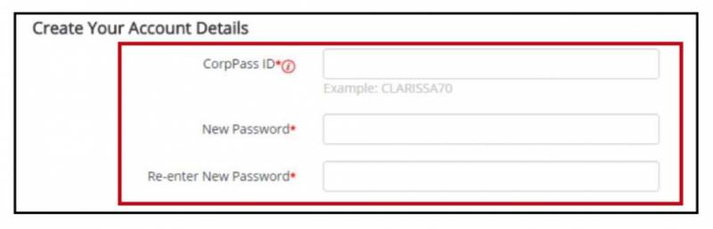 c) Enter a CorpPass ID and password of your choice. (Note: The password set must be at least 8-24 characters and contain both alphabetic and numeric characters. Special characters are optional.)