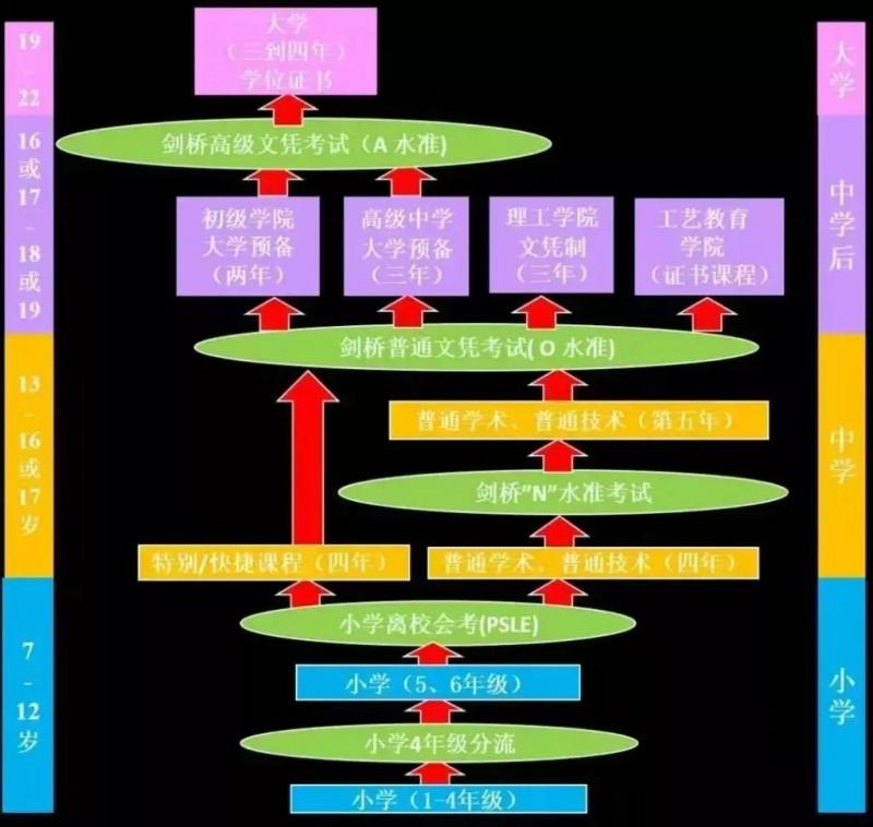 普通双语班和延长双语班的学生分别经过6年和8年的小学教育后,通过PSLE的考试,被分别编入中学(相当于我国的初中) 三种不同的课程班:特选课程班、快捷课程班、普通课程班。