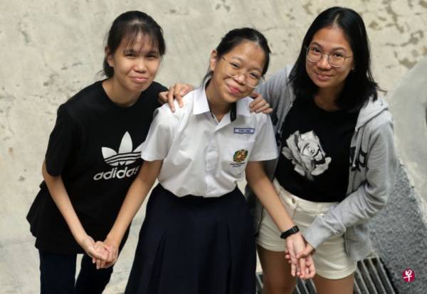 程佳轩(中)以12分佳绩成为圣升英校普通学术源流状元,姐姐程佳倩(左)及程嘉雯(右)陪她一起领取成绩,为过世的父亲送上最好的礼物。(邬福梁摄)