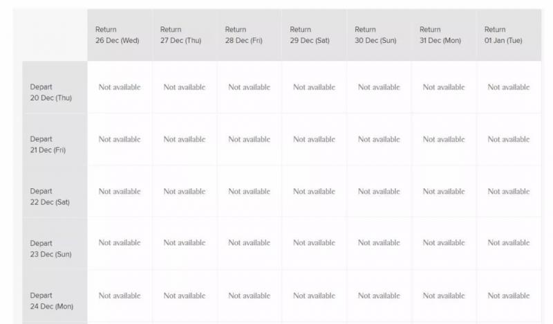 于是,年底回中国航班一票难求,节后回新加坡也一票难求。航空公司订票网站的这种界面大概大家见惯了: