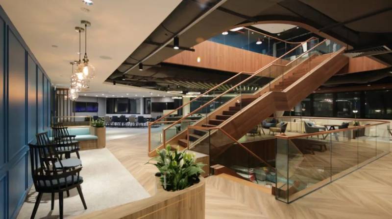 Distrii办伴新加坡共和大厦空间内部设计延续了办伴的一贯风格,兼具商务与温度,在设计过程中将这座新加坡最高的甲级写字楼4到7层全部打通,注重空间里办公人群的互动与交流,楼梯的设计提升了整个空间的视觉效果又有艺术感,在这里办公通透又舒适。