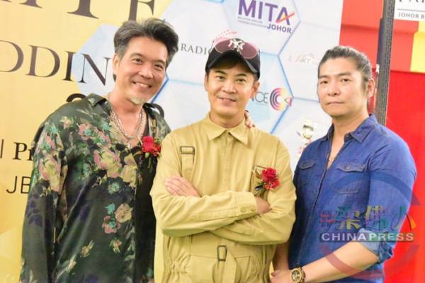 新加坡艺人曹国辉(中)邀得友人雷邦洪(左)担任此次婚纱展创意总监,右为参展单位代表潘伟衡。