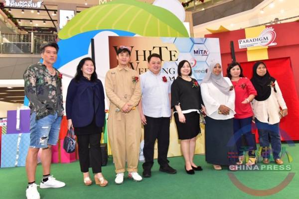 雷邦洪(左起)、蔡巧莲、曹国辉、张凯翔、郭玥珠、苏海达、吴佳丽和罗丝,出席“白色婚礼”婚纱展新闻发布会。