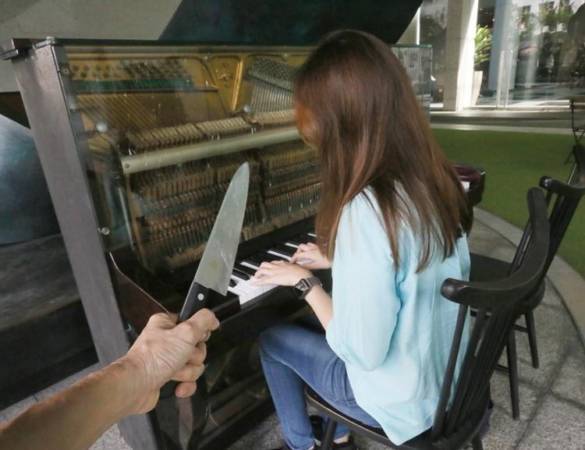 女郎深夜在市区重建局大楼底层弹钢琴,没有吸引知音人,却引来刀匪抢劫,还被押到提款机提款,吓破胆之余还损失了1052元(约3156令吉)。