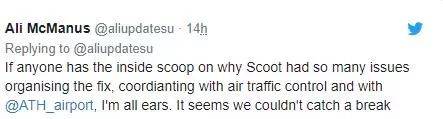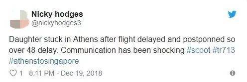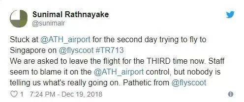 一名这次受影响的乘客发Twitter称,洗耳恭听有人可以给她解释---为什么酷航在组织修复时遇到那么多问题,并与空中交通管制和雅典机场协调一致。还表示乘客们因此而无法好好休息。