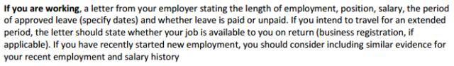 Employment Letter,如果已经工作,包括工作时长、职位、薪水、批准假期、是否是带薪假等,详细看下图