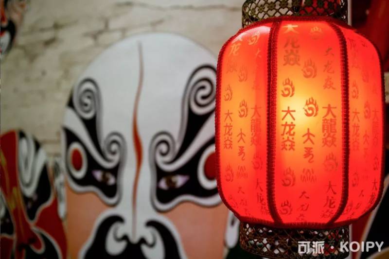 京剧脸谱的墙面,厅里都是木桌长凳