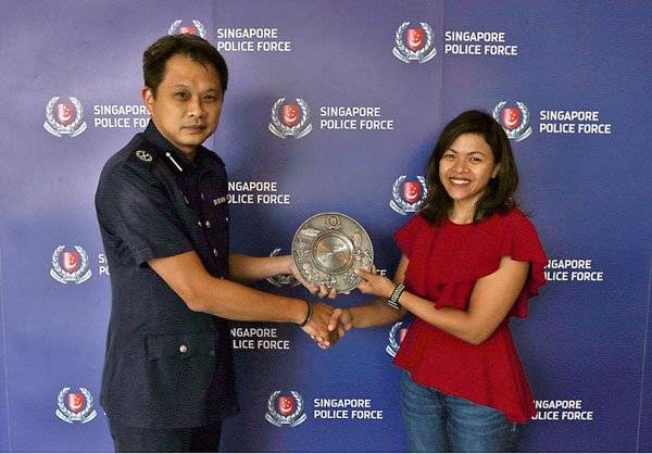 女项目经理坎雅机警识破窃案,机场警署副署长吴伟勤副助理警察总监颁发公众精神奖表扬。(警方提供)