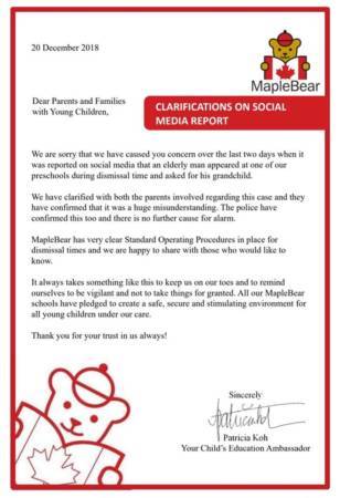 广告位于合乐路(Havelock Road)的Maple Bear 托儿所本月20日,在Facebook页面上发出声明,表示这起事件是一场误会。