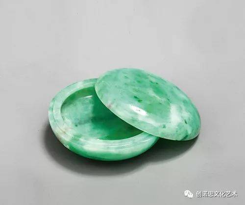 此件胭脂盒以整块翡翠精雕细琢而成,玉质细腻莹亮,宝光内蕴,绿色之中又微有紫蕴,颜色一流,以字母扣上下相连,严丝合缝,小巧精致,可遇而不可求也。