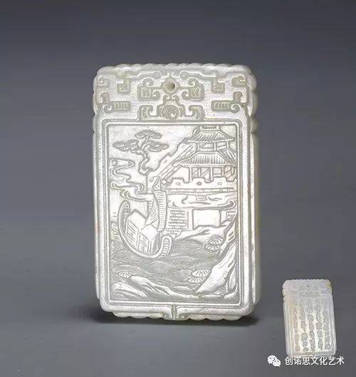 此件白玉子冈牌玉质温润,质地白皙细糯,油性丰富,抚之滑润,造型设计精巧,雕工精湛,一面刻有山水滕王阁风景,层次分明,一面刻有文字藤王阁诗句,朴实自然,琢磨细腻考究,令人爱不释手。