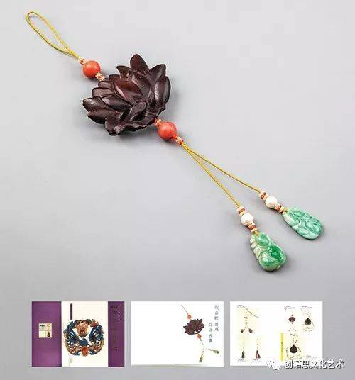 此件腰?为清宫造办处精心打造,上下两颗红琉璃珠,以珍珠间隔,以紫檀为主体雕刻双面莲花,下坠有二个翡翠,做工精致,彰显皇家气场。附资料