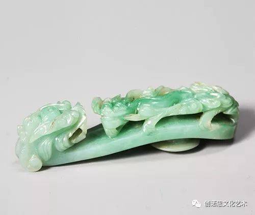 此件翡翠龙钩长8.5cm,通体布满绿色,主体镂空雕苍龙,呈卧形姿态,龙首回钩,刀法线条含蓄刚劲,雕琢精湛,翠绿丰富,纹理全面,用料质佳,是较少见的上等翡翠中难得的雕件。