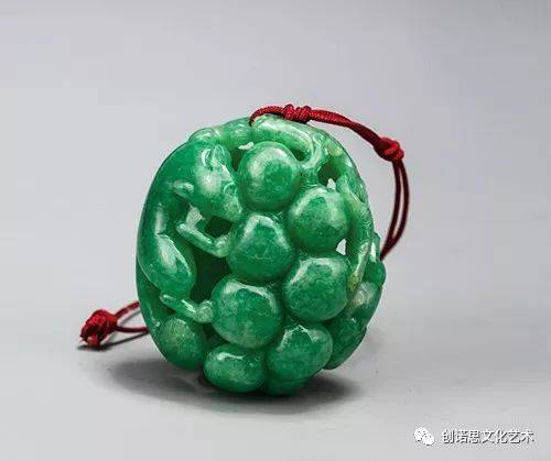 此翡翠用料讲究,质料绝佳,颜色浓粹明艳,雕工精细,以镂雕和高浮雕手法雕刻出葡萄松鼠,寓意多子多孙,造型小巧制作工艺精绝,难能可贵。