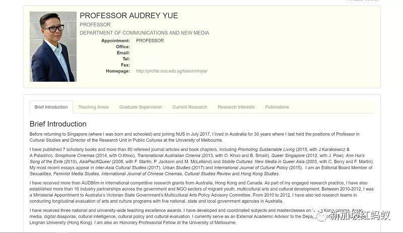 广告这位教授是余燕珊(Audrey Yue)。新加坡人,曾在墨尔本大学任教,去年7月加入新加坡国立大学。