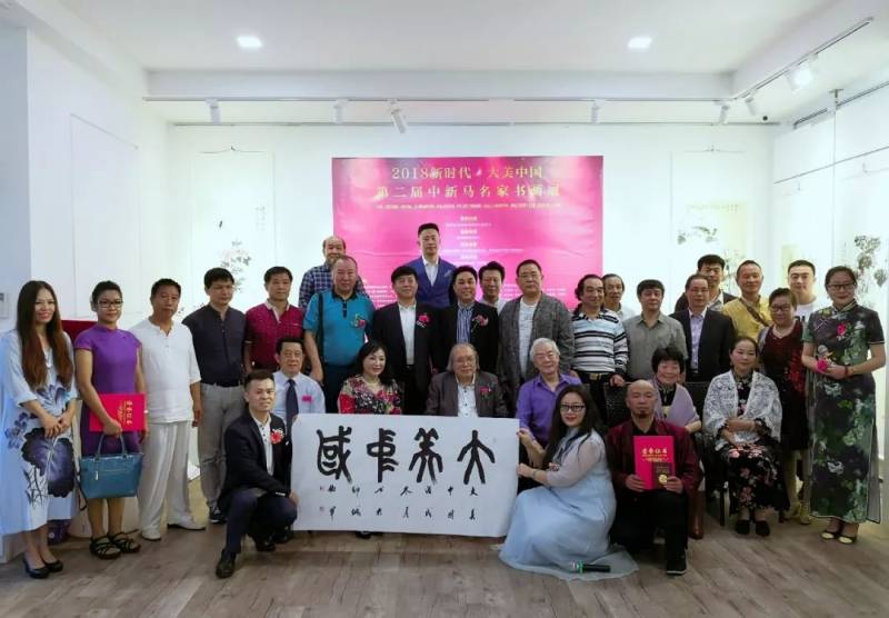 “2018新时代·大美中国”第二届中新马书画名家作品展开幕式,受邀嘉宾与主办、承办及参展书画家们合影留念。
