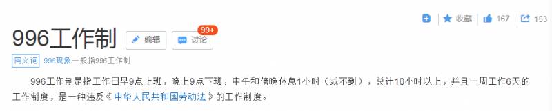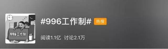 2019年1月下旬,一家名为“杭州有赞科技”的公司宣布将实行“996”工作制,即每天早9点半到岗,一直工作到晚上9点。遇到紧急项目时,每周工作6天,每天工作时间可能会更久。