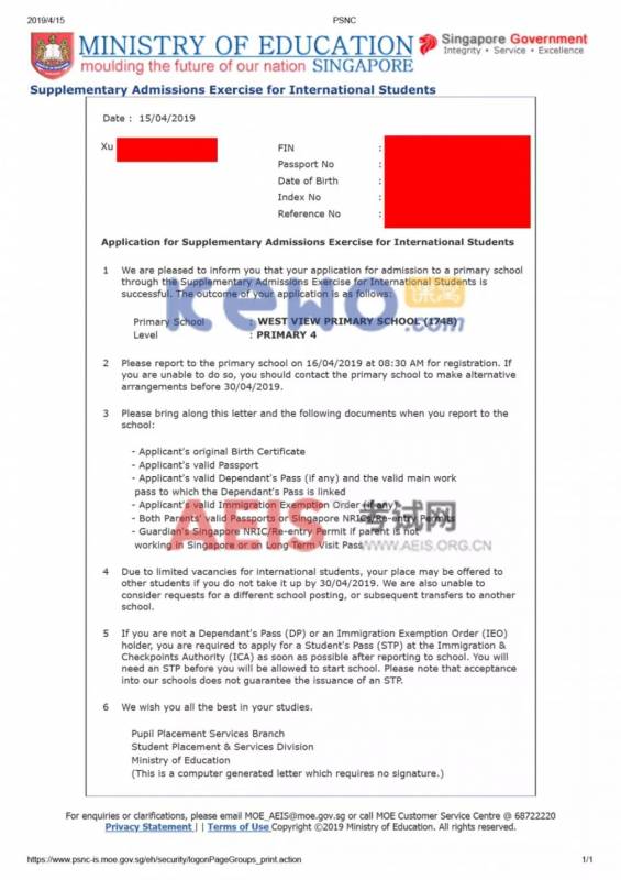 被录取到WEST VIEW PRIMARY SCHOOL(P4)